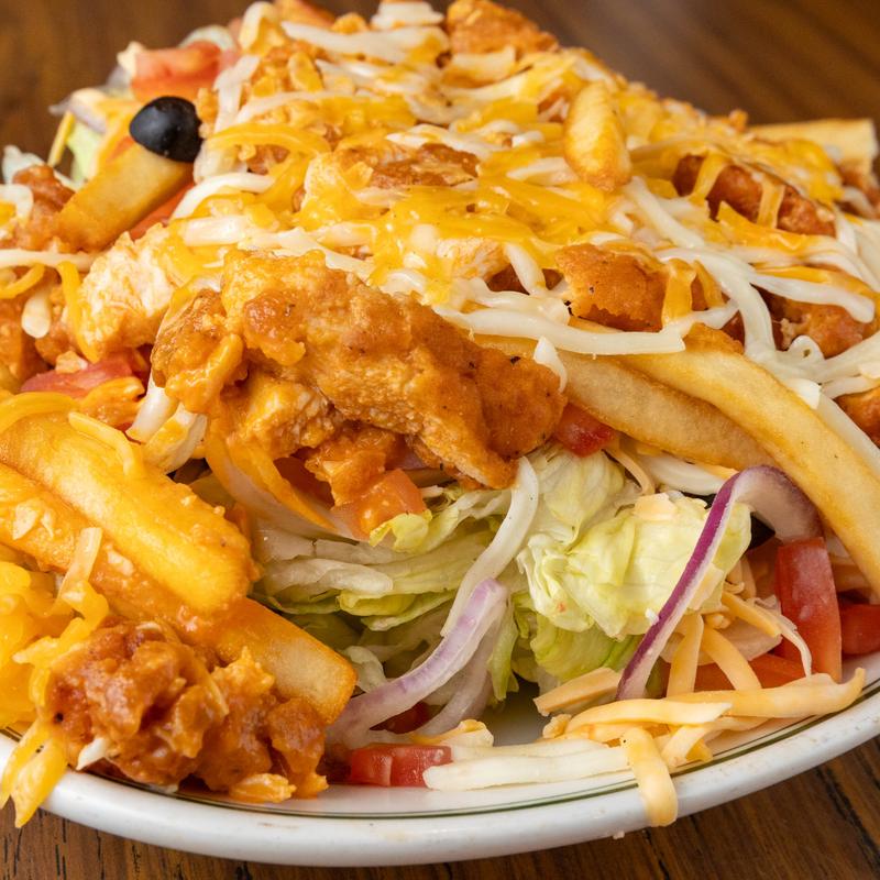 Choice of grilled or crispy chicken, fresh-cut fries on a bed of lettuce, tomatoes, carrots, black olives, red onions, provolone & cheddar.