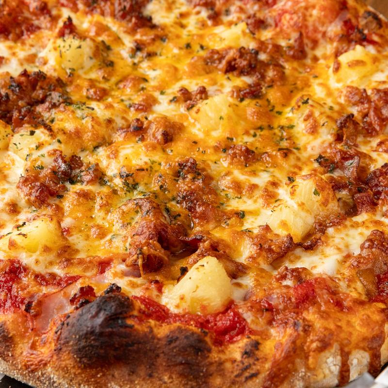 You'll swear you're at a luau. Red sauce, ham, bacon, pineapple, provolone & cheddar.